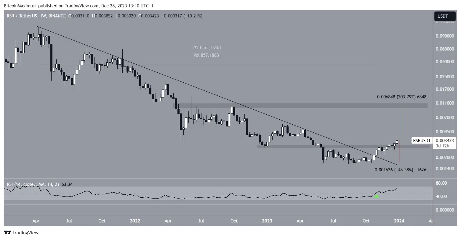 Цена RSR двигалась под нисходящей линией сопротивления с апреля 2021 года. Снижение привело к минимуму в $0,0016 в августе. После этого актив начал восходящее движение и поднялся выше линии сопротивления, которая продержалась 924 дня.