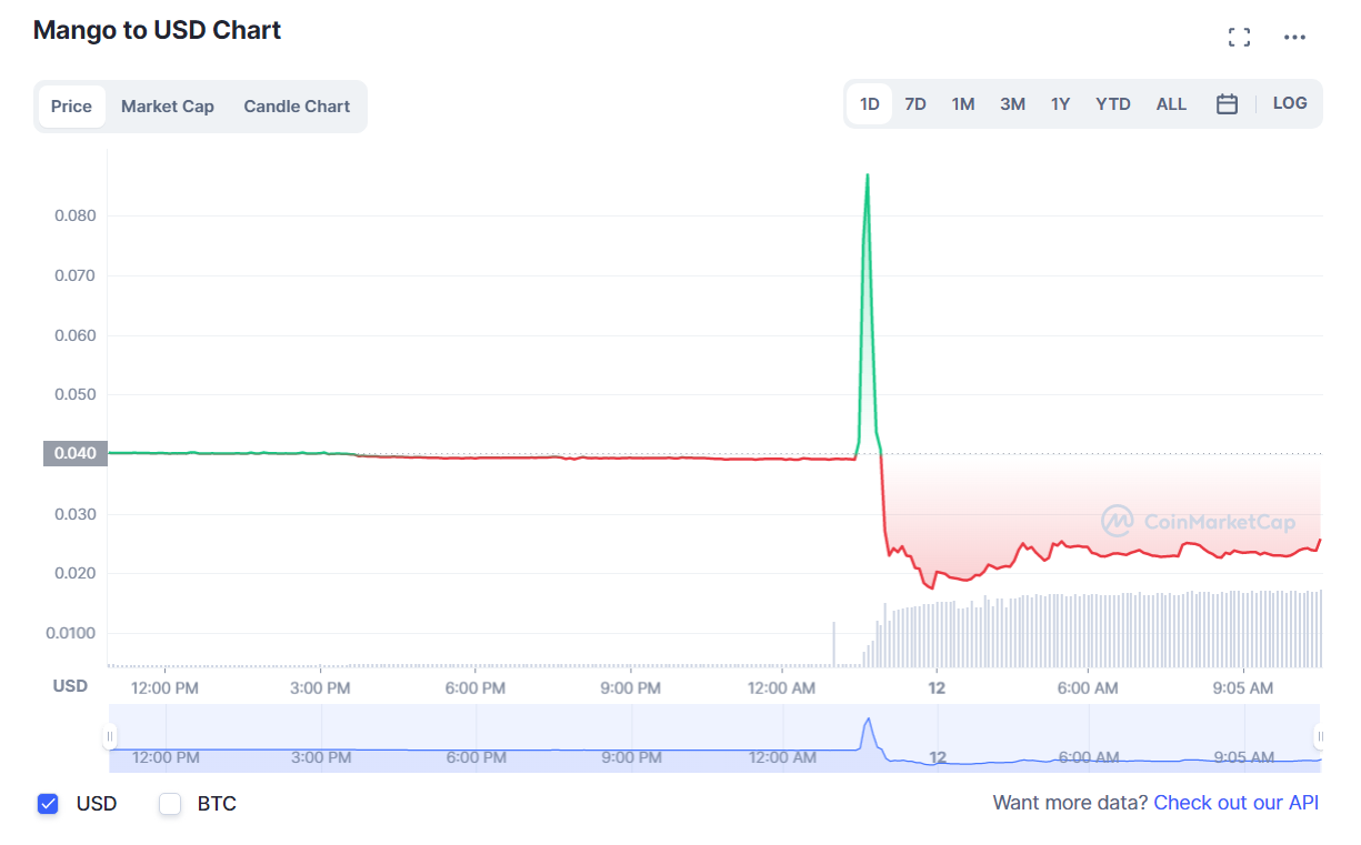 В качестве реакции на эти события курс нативного токена протокола MNGO сначала устроил короткое ралли к $0.087 на фоне ценового манипулирования, а затем рухнул до $0.022, потеряв почти половину своей стоимости. Монета торгуется сейчас на 95% ниже своего исторического максимума, отмеченного в сентябре 2021 года.