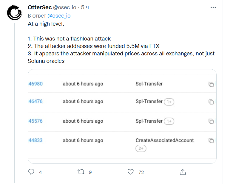 Тем временем OtterSec также продолжает уточнять и обновлять имеющуюся на данный момент информацию. В частности, эксперты подтвердили, что в ходе атаки на Mango Markets не использовались флэш-кредиты. Кроме того, известно, что злоумышленник использовал для финансирования своего счета $5,5 млн, полученных под залог на бирже FTX.