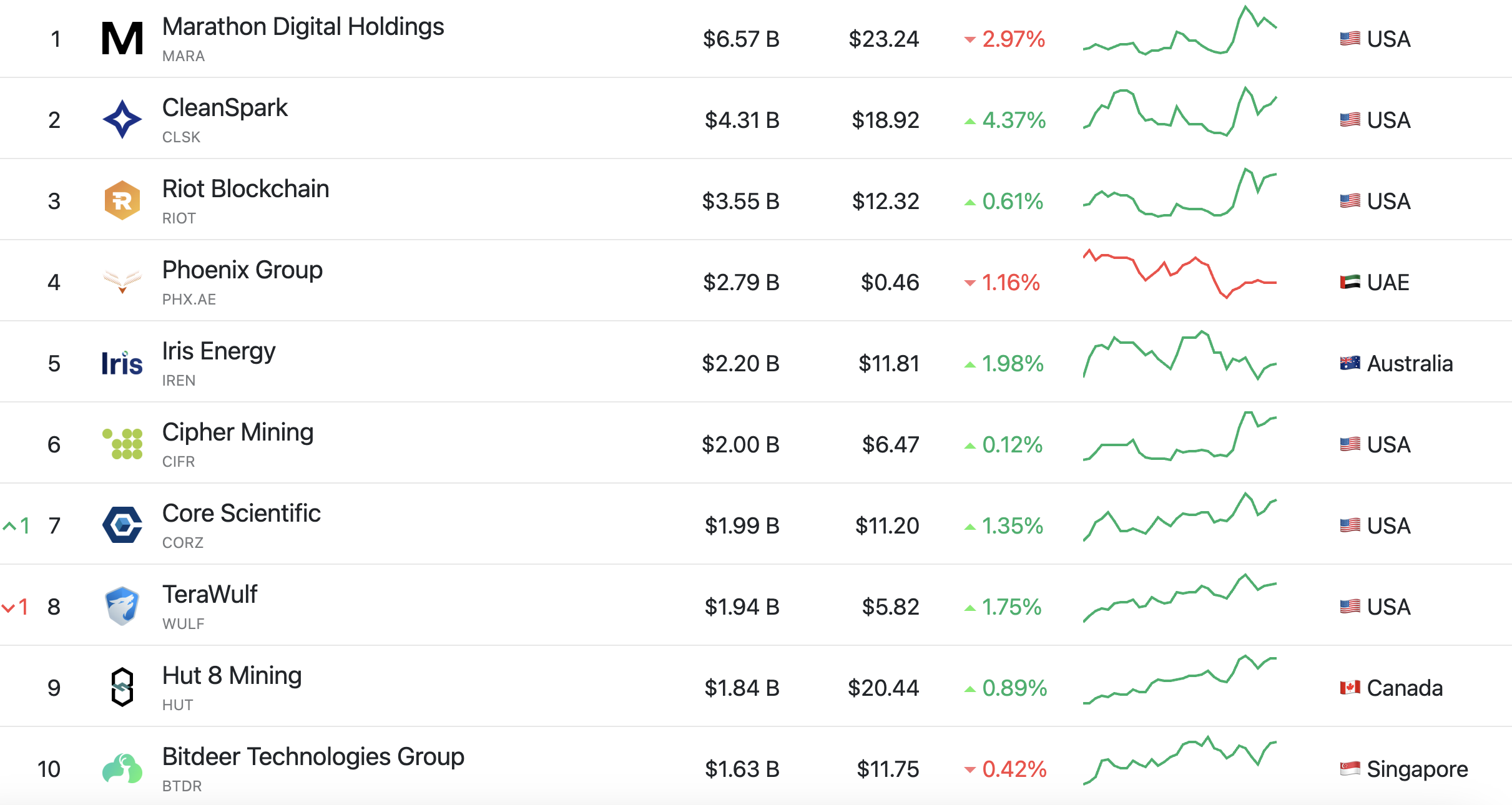 Marathon Digital остается крупнейшей в мире компанией по добыче биткоина (BTC). По данным CompaniesMarketCap, капитализация фирмы оценивается в $6,77 млрд, что на 48% превышает рыночную стоимость второго по величине майнера CleanSpark.