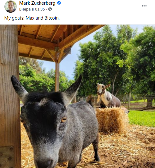 Однако последний пост Марка Цукерберга в Facebook всерьез озадачил трейдеров и криптоэкспертов. В нем основатель крупнейше соцсети поделился информацией, что двух домашних козлов, которые живут на ферме Цукерберга, зовут Биткоин и Макс.