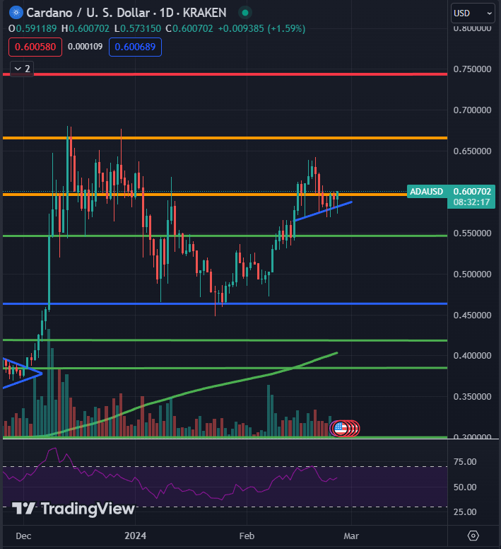 Аналитик под псевдонимом Ssebi считает, что в настоящий момент ADA необходимо пробить сопротивление в районе $0,65. Только так криптовалюта сможет уйти от рисков, связанных с ее структурой графика «голова и плечи»