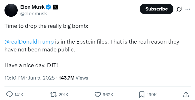 Особый резонанс вызвал пост Маска, в котором говорится, что Трамп есть в «файлах Эпштейна». По его словам, упоминание в них президента — единственная причина, по которой их не обнародовали.
