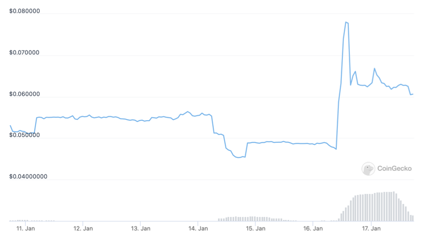 GRAPE начал день 16 января на уровне $0,047. Однако через четыре часа после твита Илона Маска за него давали уже $0,078. Как и следовало ожидать, памп продлился недолго. На момент написания статьи GRAPE стоит $0,06. За сутки токен подешевел на 5%, однако в недельном отношении он все еще торгуется с повышением на 13%. Исторический максимум был достигнут 15 сентября 2021 года на уровне $0,347, с тех пор монета потеряла 82% стоимости.