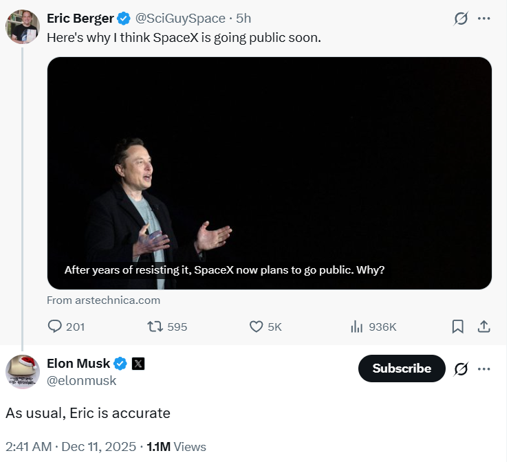 В ответ на публикацию журналиста Эрика Бергера, озаглавленную «Вот почему я считаю, что SpaceX скоро станет публичной», Маск заявил: «Как обычно, Эрик прав». Бергер пользуется репутацией наиболее авторитетного репортера, освещающего деятельность SpaceX.