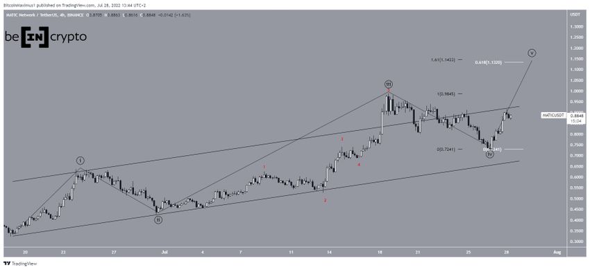 В более краткосрочной перспективе MATIC запустил 18 июня пятиволновую бычью ценовую структура и только что завершил откат четвертой волны. Наиболее вероятной целью и вершиной пятой волны является область $1.13-$1.14 (внешняя коррекция 1.61 волны 4 и 0.618 длины волн 1 и 3 (белый цвет)).