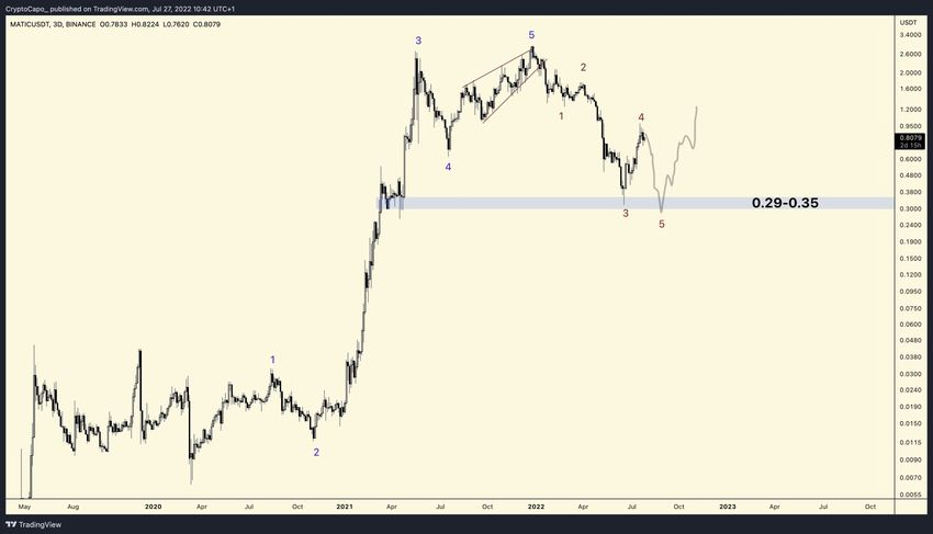 Криптовалютный трейдер @CryptoCapo поделился с читателями графиком MATIC, отметив, что рынок завершает волну 4 пятиволновой медвежьей структуры.