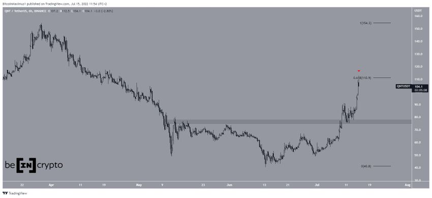 Курс QNT упал 14 июня к минимуму на $40 и с тех пор рос. В итоге 15 июля коин достиг максимума на $112.50. Этот максимум был сформирован непосредственно в районе уровня Фибо 0.618 коррекции, который обусловил отскок цены (красный значок).