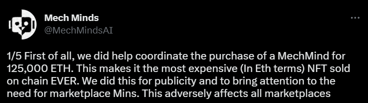 Разработчики NFT-коллекции MechMinds перепродали себе невзаимозаменяемый токен за 126 000 ETH, сделав сделку самой крупной в истории рынка цифровых коллекционок