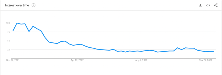 После хайпа 2021 года ажиотаж вокруг метавселенных пошел на спад в 2022 году. Данные Google Trends демонстрируют постепенное снижение интереса к этой теме. Число поисковых запросов по слову «метавселенная» плавно снижалось: