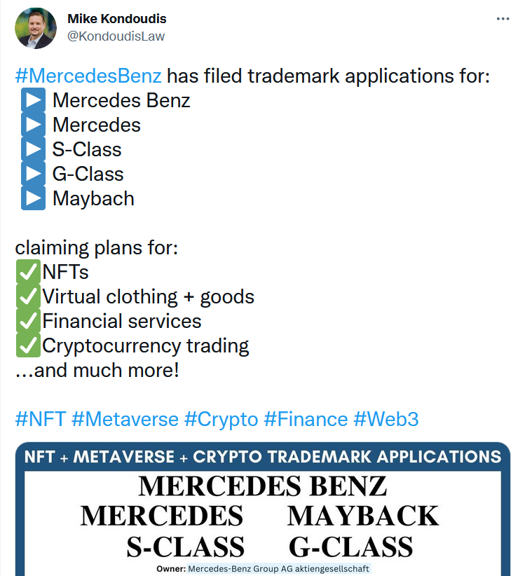 Декабрь принес новую весть. Немецкая автомобильная корпорация Mercedes-Benz Group AG тоже подала пять заявок на регистрацию товарных знаков в областях NFT и метавселенной. Как сообщил в «Твиттере» лицензированный поверенный по товарным знакам Майк Кондудис (Mike Kondoudis), заявки на регистрацию товарных знаков для «Mercedes Benz, Mercedes, S-Class, G-Class и Maybach» будут включать лицензии на NFT, виртуальную одежду и товары, розничные магазины для виртуальных запчастей для автомобилей и многое другое.