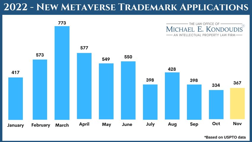 Несмотря на медвежий крипторынок, в 2022 году известные мейнстримные бренды продолжали проявлять высокий интерес к освоению метавселенных. Так, к ноябрю в США было подано 5364 заявки на регистрацию товарных знаков в метавселенной и сфере виртуальных товаров/услуг.