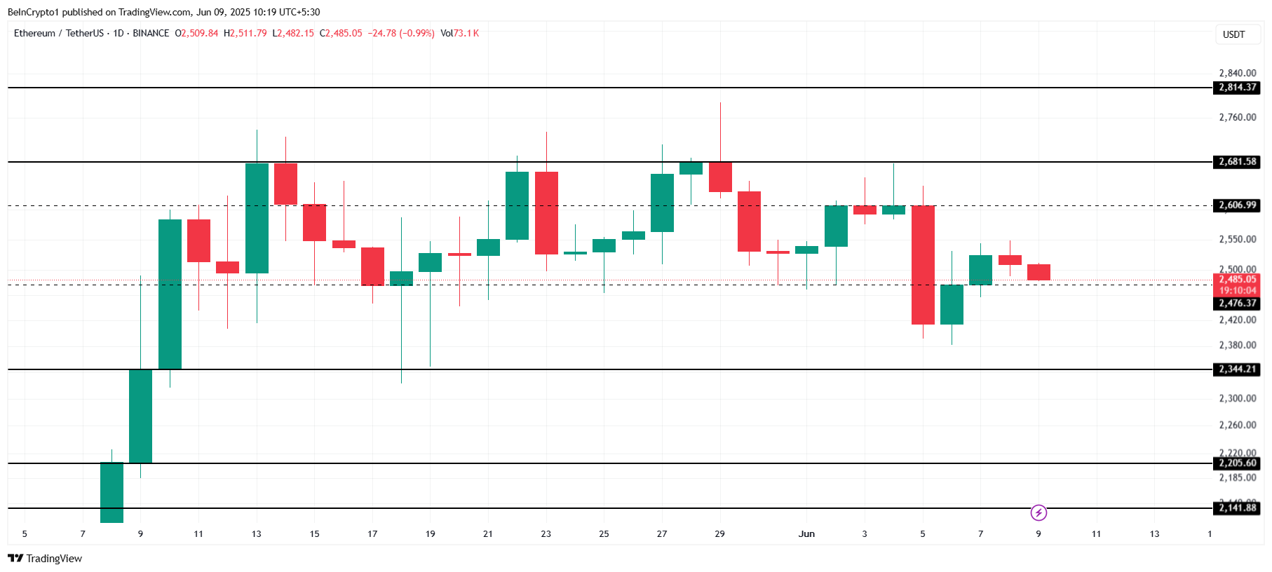 Если Ethereum удастся отскочить от уровня поддержки в $2 476 и давление продаж снизится, у ETH появится шанс на восстановление. При условии, что цена удержится и рыночные настроения улучшатся, Ethereum может подняться до $2 606 или даже $2 681. Это опровергнет медвежий прогноз и станет началом нового ралли.