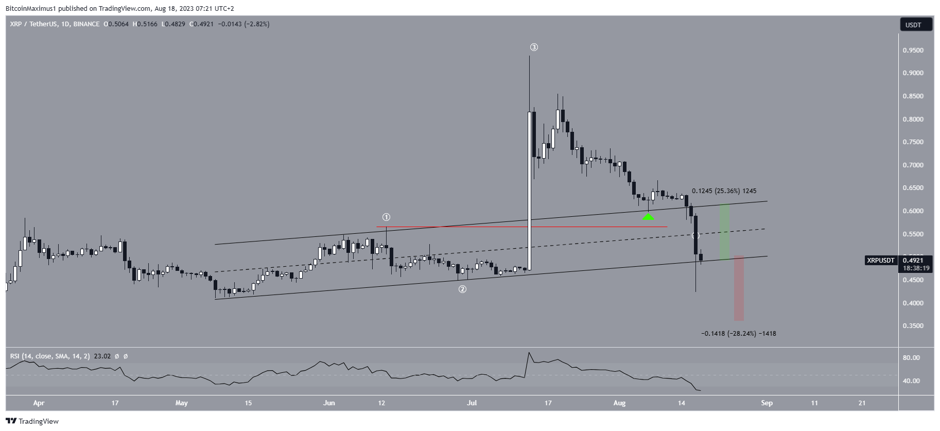 Падение 17 августа свело на нет бычий сценарий, который должен был привести XRP к отметке $1. Если цена актива выйдет за нижнюю границу текущей модели, она может упасть еще на 28% и достичь горизонтальной области поддержки $0,35.