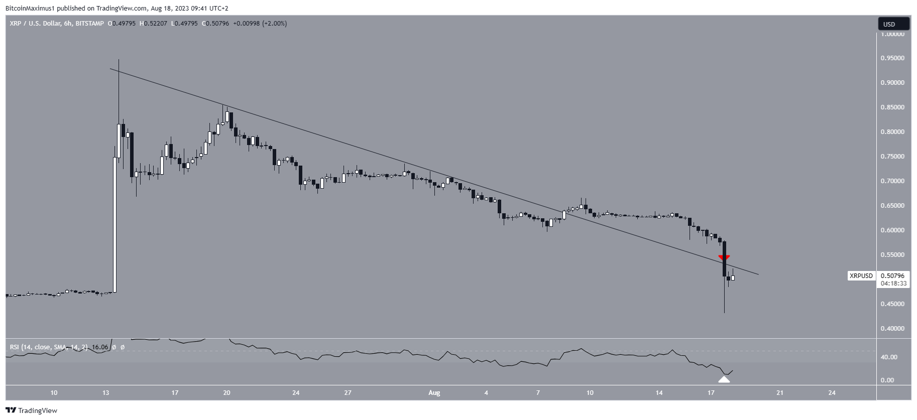 Краткосрочный шестичасовой график также на дает особых надежд на отскок. Основная причина этого заключается в том, что цена XRP прорвалась выше краткосрочной нисходящей линии сопротивления, но не смогла подтвердить ее в качестве поддержки. Напротив, 17 августа цена опустилась ниже нее (на графике этот момент отмечен красным значком).