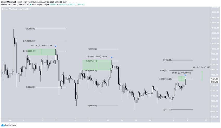 Если криптовалюта продолжит следовать за фракталом, то может дотянуться до максимума $9 600, расположенного немногим выше уровня 0.79% коррекции Фибоначчи и на 2% выше от предыдущего максимума.