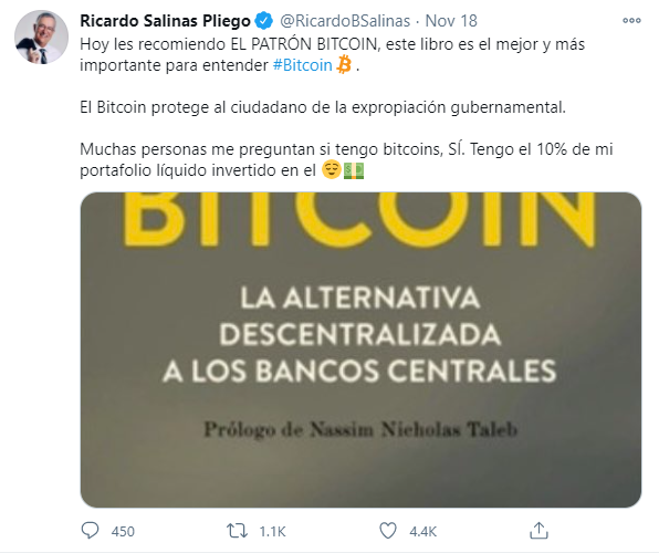Мексиканский бизнесмен Рикардо Салинас Плиего, основатель и президент группы Salinas, написал в Twitter, что он инвестировал большую часть своих ликвидных активов в биткоины.