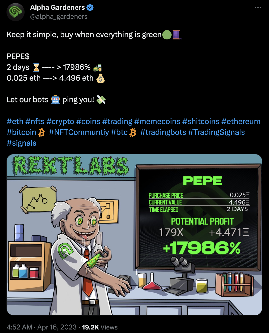 Токену удалось привлечь настоящую аудиторию благодаря стратегическому использованию таких платформ, как Dextools, и множеству крупных точек входа. Pepe без значительных усилий вошел в тренды Твиттера, продемонстрировав возможности маркетинга. Стоит также отметить стремление проекта поддерживать высокий уровень ликвидности и пампы без осязаемого вреда для рынка.