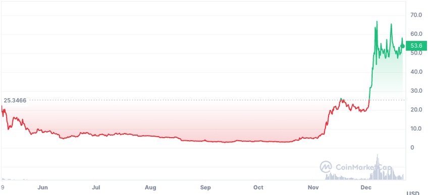С момента запуска в мае ORDI заметно вырос на 109,10%, и в настоящее время его цена составляет $53,39, а рыночная капитализация превышает $1,1 млрд.