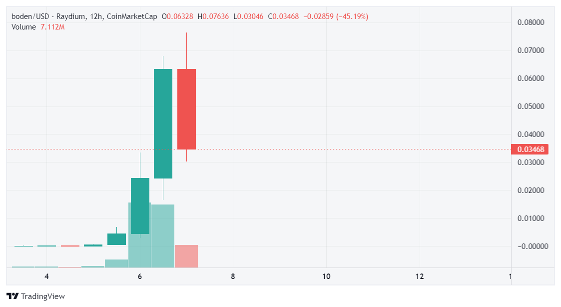 По данным CoinMarketCap, «мемная» монета дебютировала с отметки в $0,00005. Однако за считанные минуты стоимость BODEN взлетела на 126 000% до $0,06378, а капитализация превысила $40 млн.
