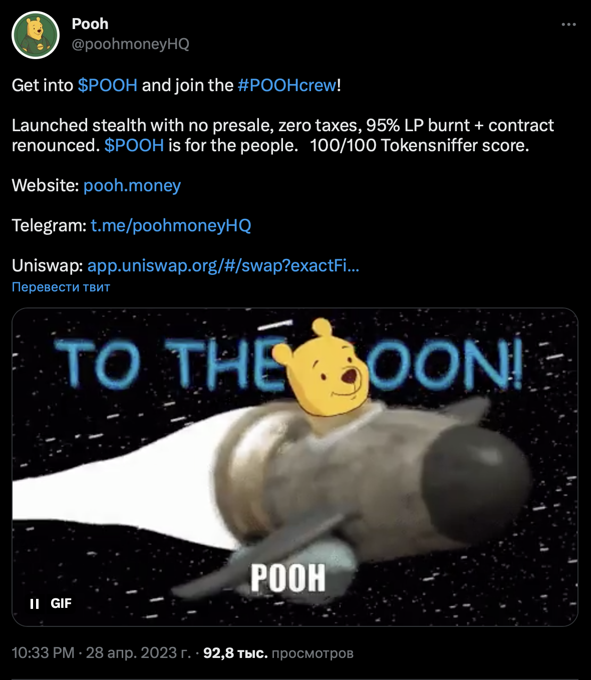 Токен POOH был запущен в конце апреля. 95% предложения мемкоина с сожженными ключами хранится на Uniswap, а оставшиеся 5% выделены для листинга на централизованных биржах. Разработчики проекта заявили, что их главная цель состоит в органичном росте и развитии POOH, а также в наделении владельцев токенов равными правами.
