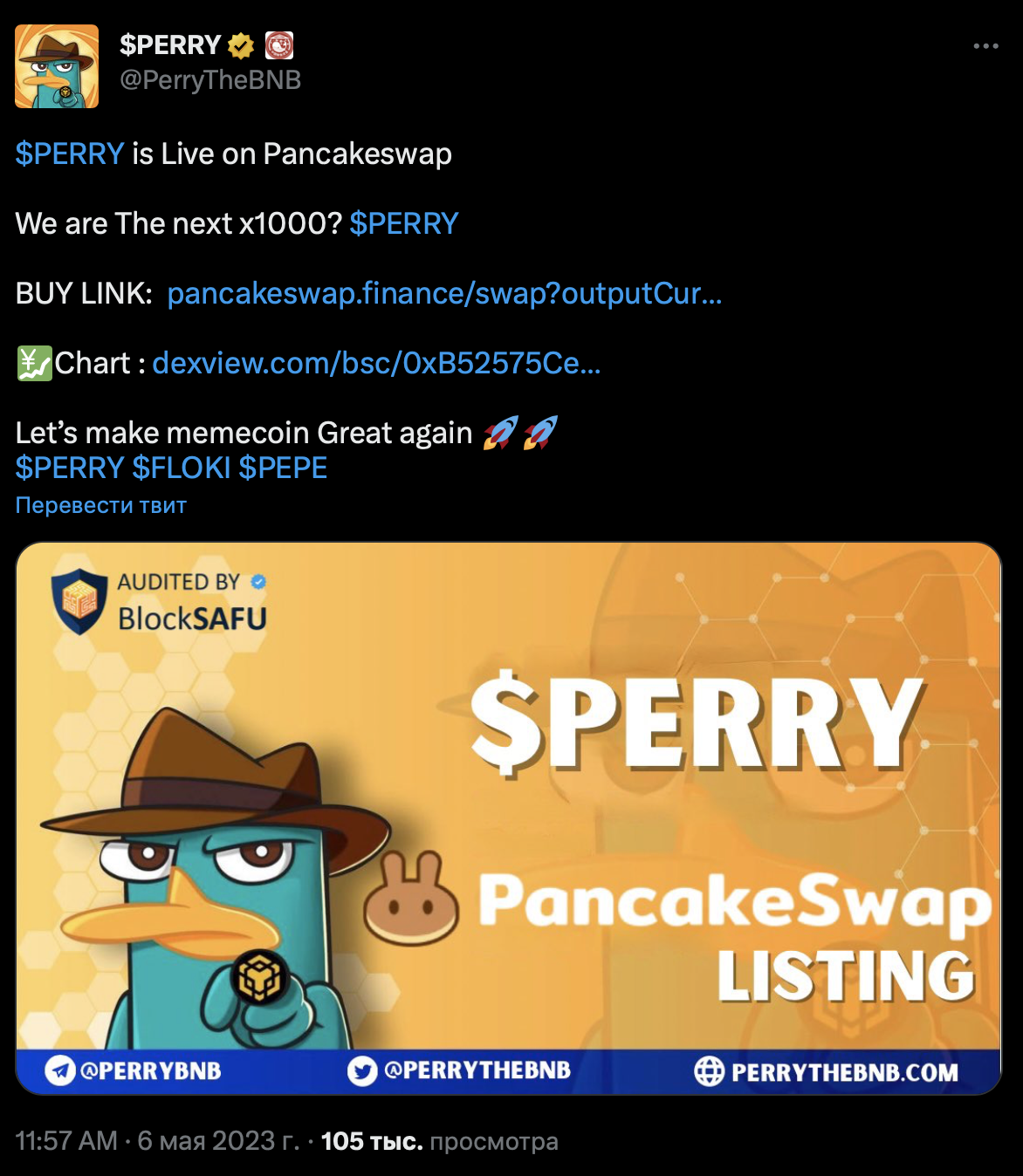 Perry The BNB стремится возродить популярность мемкоинов на Binance Smart Chain. За последние 24 часа цена токена взлетела на 578,86% – до $0,00000001549. Суточный объем торгов Perry составляет более $7 млн, а информация о максимальном предложении и рыночной капитализации пока недоступна.
