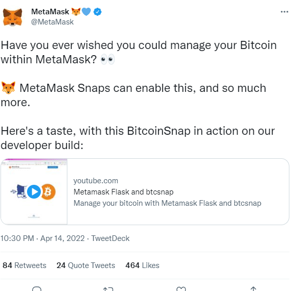 Кошелек MetaMask, сфокусированный на экосистеме Ethereum, может вскоре обзавестись поддержкой биткоина. Об этом у себя в твиттере сообщили разработчики проекта. По их словам, посреднический модуль под названием Snaps уже скоро позволит пользователям разворачивать собственные биткоин кошельки, а также кошельки независимых блокчейн-сетей.
