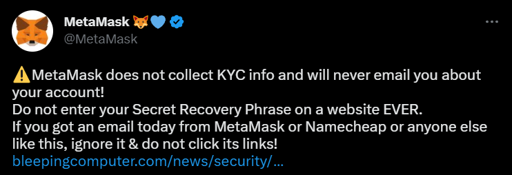 Владельцы криптовалютного кошелька MetaMask столкнулись с фишинговой рассылкой из-за взлома доменного провайдера Namecheap