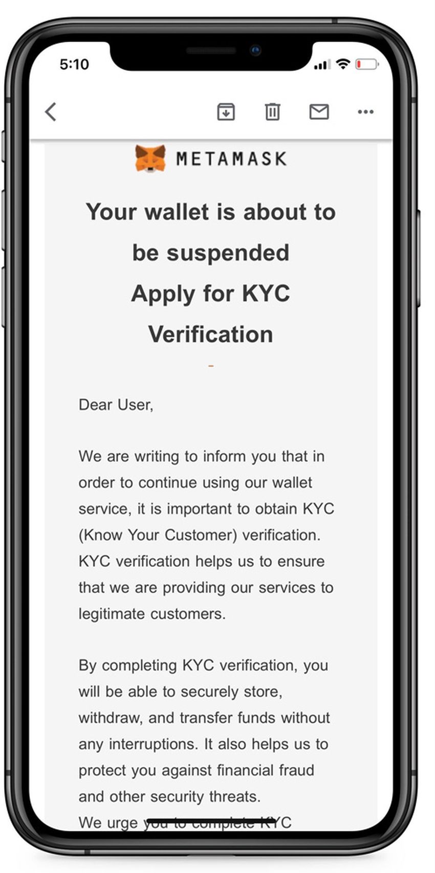 В рассылаемых письмах мошенники предупреждают владельцев MetaMask якобы о закрытии аккаунта из-за непрохождения требований по верификации. В письме редакции требовалось завершить прохождение верификации через мошеннический сайт (kyc.bip-portal[.]info), который внешне похож на оригинальный.