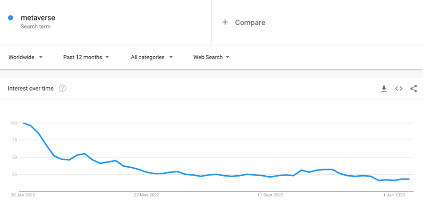 Это объясняет тот факт, что интерес к метавселенной стагнирует. Согласно Google Trends, количество поисковых запросов по слову metaverse достигло исторического максимума в январе 2022 года, но уже ко второму кварталу заметно снизилось и с тех пор находится в состоянии плато.