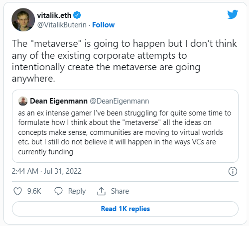 Соучредитель Ethereum Виталик Бутерин считает, что попытки корпораций построить метавселенную потерпят неудачу