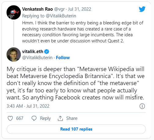 Виталик Бутерин ответил Айгенманну: «Концепция с метавселенными реализуется, но я не думаю, что какие-либо из существующих корпоративных попыток намеренно создать метавселенную к чему-то приведут».