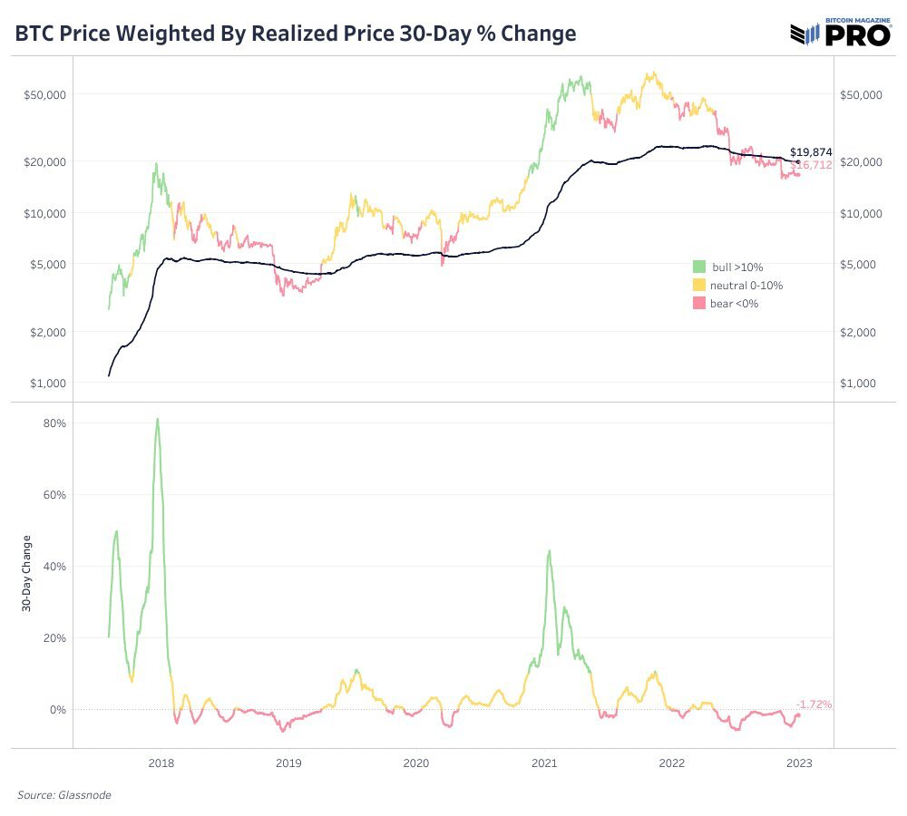Как и на традиционных рынках, для определения доходности вложений криптоинвесторы используют базовую стоимость актива. Чтобы ее рассчитать, нужно сравнить цену BTC c 30-дневным изменением реализованной стоимости в процентах. Известный аналитик @DylanLeClair_ недавно опубликовал в «Твиттере» график этого показателя. Он отметил, что метрика опустилась ниже $20 000.