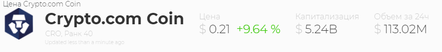 Цена криптовалюты проекта crypto.com coin (CRO) на фоне новостей подскочила почти на 10%. На момент написания материала CRO торгуется на уровне ~$0,2. Рыночная капитализация криптовалюты выросла до $5,2 млрд.