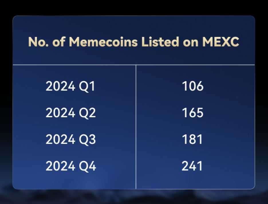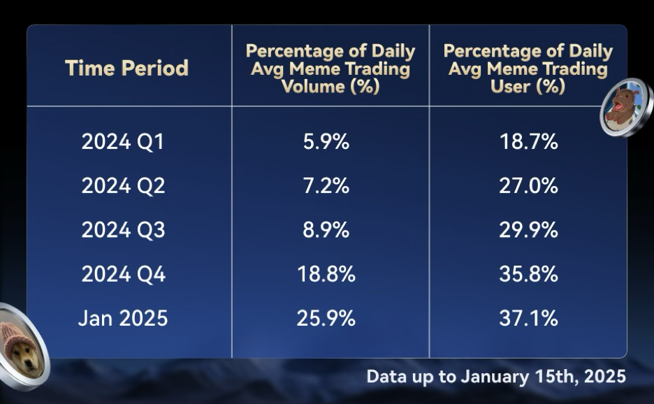 MEXC предприняла стратегические шаги для расширения своих услуг по торговле мемкоинами, запустив 24 декабря 2024 года Зону Meme+. Эта специализированная зона оказалась весьма успешной: за первый месяц существования в ней было включено в листинг около 124 популярных мемкоинов. Эта инициатива дала значительный импульс, что привело к дальнейшему росту активности торговли мемкоинами на MEXC в январе 2025 года. Вовлеченность пользователей достигла новых высот: доля ежедневно торгующих пользователей выросла до 37,1%, а на долю мемкоинов пришлось 25,9% среднедневного объема торгов платформы.