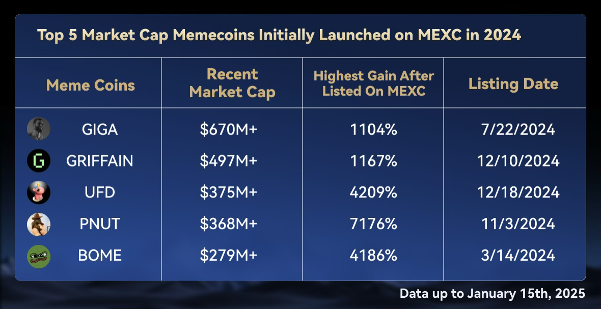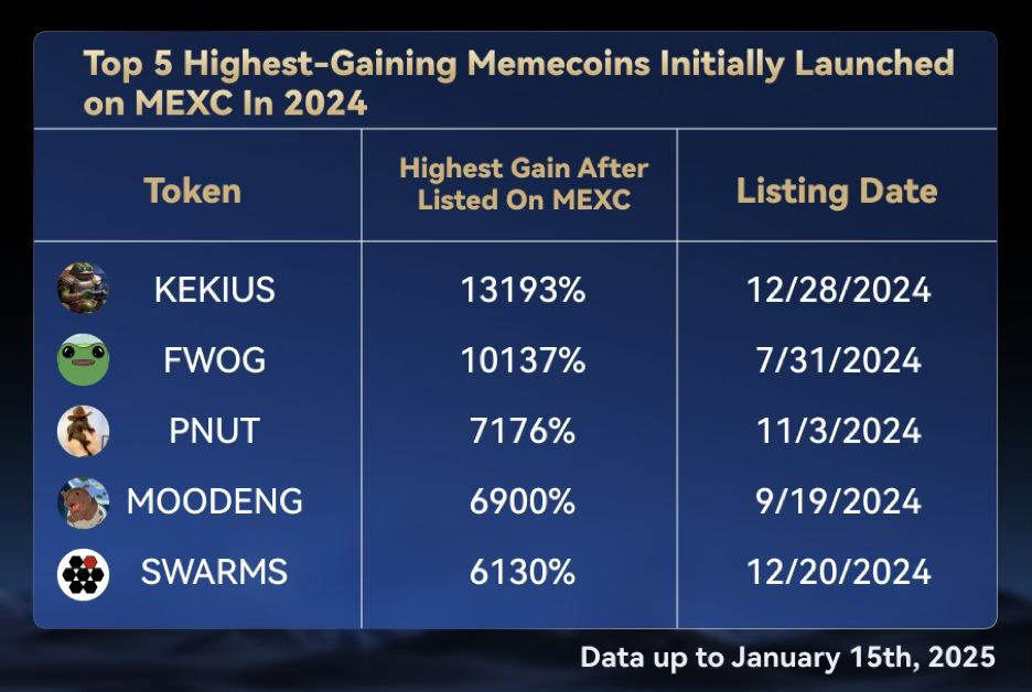 SponsoredВ 4 квартале 2024 года MEXC продемонстрировала уверенное лидерство на рынке, сделав стратегический акцент на секторе мемкоинов и успешно представив на своей платформе более 240 высококачественных мем-проектов. Тщательный отбор проектов на бирже оказался весьма успешным: 5 лучших мемекоинов, вновь включенных в листинг в 2024 году, достигли выдающихся результатов – их цены зафиксировали средний пиковый прирост более 8 700%, в то время как выдающиеся результаты KEKIUS и FWOG превысили прирост в 10 000%. Показатели рыночной капитализации были не менее впечатляющими: 5 лучших мемкоинов в среднем достигли пикового прироста более чем на 3 500%, а лидером стал PNUT, который достиг исключительного максимального прироста более чем на 7 000%.