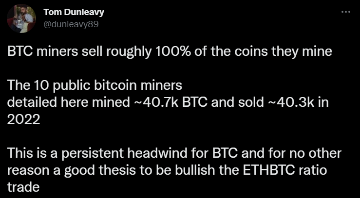 Биткоин-майнеры распродали почти 100% добытой за 2022 год криптовалюты. Об этом у себя в твиттере сообщил старший аналитик Messari Том Данливи.