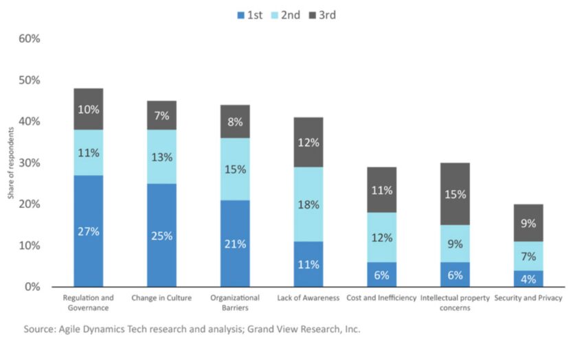 Помимо этого, многие также указали на изменения культуры, организационные барьеры и недостаточную осведомленность о том, как работает блокчейн.