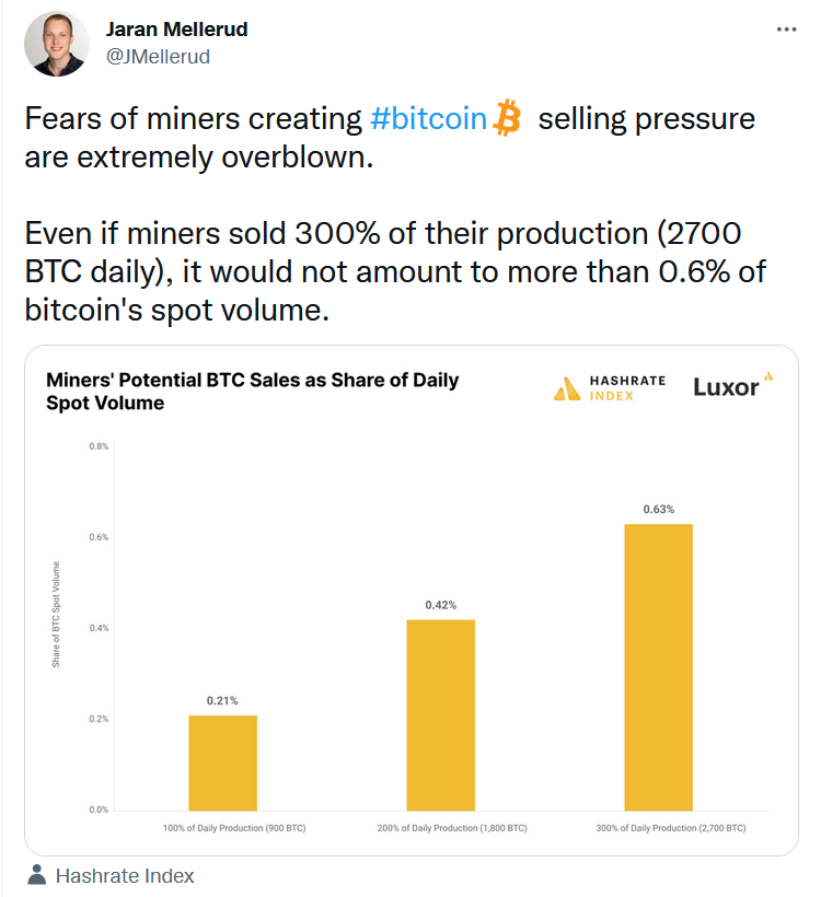 Впрочем, популярный криптовалютный и финансовый аналитик Джаран Меллеруд (Jaran Mellerud) из Hashrate Index написал, что считает «чрезвычайно раздутыми» опасения по поводу того, что майнеры могут снова оказать сильное понижательное давление на курс биткоина, распродавая монеты. По его мнению, такие объемы продаж все равно остаются лишь каплей в море общего объема циркулирующего предложения BTC.