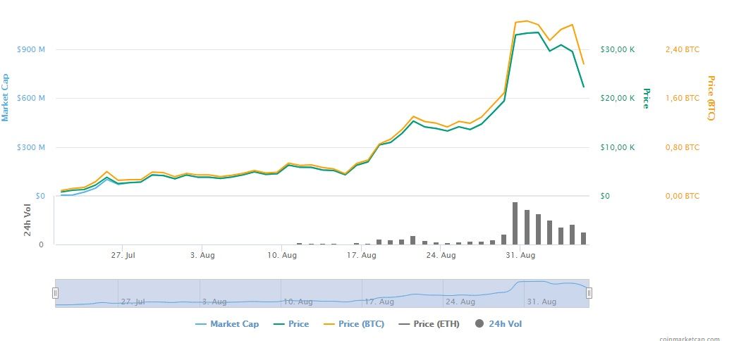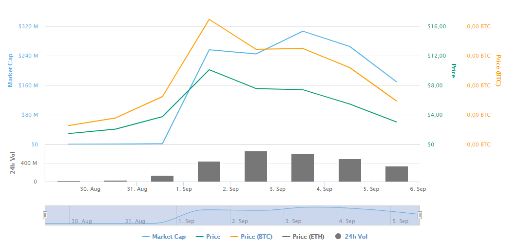 Возникший в конце августа токен смог за считанные дни подняться в цене до $10 за штуку и также быстро упасть. Сегодня монета торгуется на уровне $3,03.