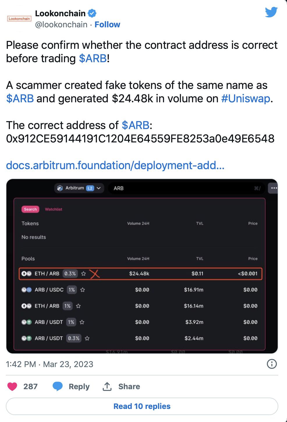 Сайт Lookonchain сообщил, что мошенник совершил сотни транзакций на сумму более $24000 с поддельными токенами ARB на децентрализованной бирже Uniswap. Еще несколько фишинговых ссылок было размещено в «Твиттере» с аккаунтов, которые выдавали себя за Arbitrum Foundation.