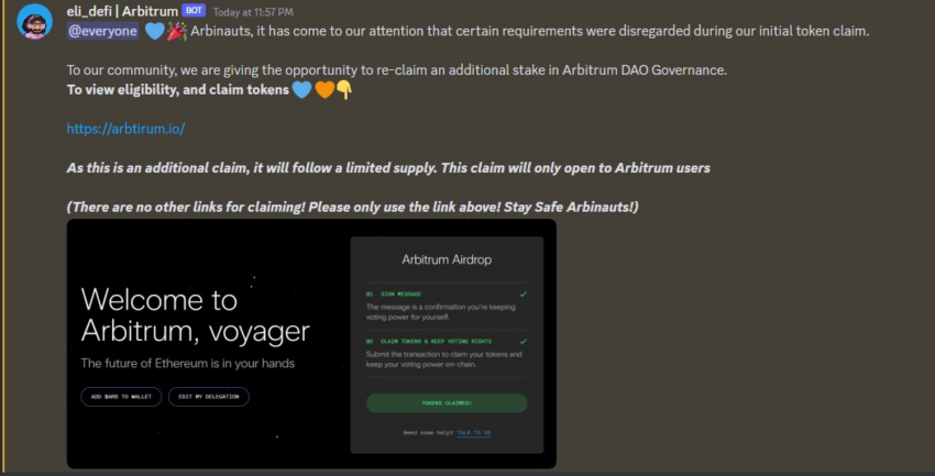 Специализирующаяся на блокчейн-безопасности компания CertiK сообщила, что 25 марта в «Дискорде» Arbitrum была размещена фишинговая ссылка. Согласно скриншоту с канала, мошенник утверждал, что пользователи могут «повторно претендовать на дополнительную долю в Arbitrum DAO». Чтобы подтвердить свое право на участие и получить токены, пользователям предлагалось перейти по ссылке, в которой Arbitrum было написано с ошибкой, как «Arbtirum».