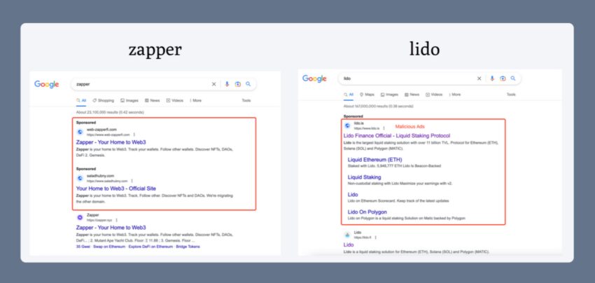 По данным аналитика, злоумышленники заманивали пользователей на фишинговые страницы таких проектов, как Lido, DefiLlama, Zapper, Orbiter Finance и Radient. Каждый из них мошенники намеренно продвигали в поисковой системе Google и в рекламе «Твиттера».