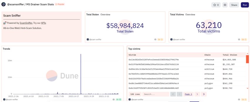 Согласно Dune, за девять месяцев злоумышленникам удалось вытащить из карманов жертв около $58,8 млн, преимущественно в Ethereum (ETH), Polygon (MATIC) и Arbitrum (ARB). Всего пострадали 63 210 пользователей.