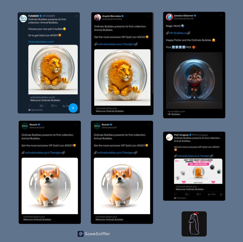 Первым на фишинговые объявления обратил известный в криптосообществе блокчейн-аналитик ZachXBT. В конце июня он заметил кластер таких постов в «Твиттере». Некоторые из них гласили о раздаче невзаимозаменяемых токенов (NFT) Ordinals Bubbles. Другие же анонсировали аирдропы от известных проектов.