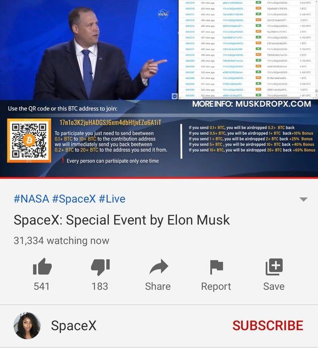 Группа мошенников создала целую серию рекламных объявлений, с помощью которых продавала приглашения на мероприятие с участием основателя Tesla и SpaceX Илона Маска. Сообщения транслировались даже по телевидению в Америке. При этом точная цена билета не была установлена. Мошенники просто предлагали перечислить от 0,1 ВТС до 10 ВТС на кошелек получателя и вход был гарантирован.