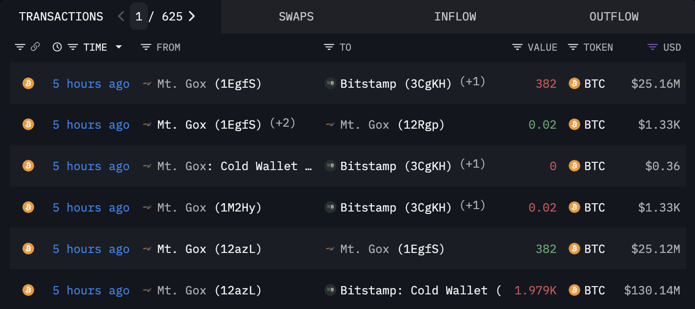 Согласно Arkham Intelligence, за несколько часов Mt. Gox в совокупности переместила $2,8 млрд. Самый крупный перевод на $2,1 млрд был осуществлен на новый кошелек, а самые последние транзакции — на четыре адреса, принадлежащие Bitstamp.