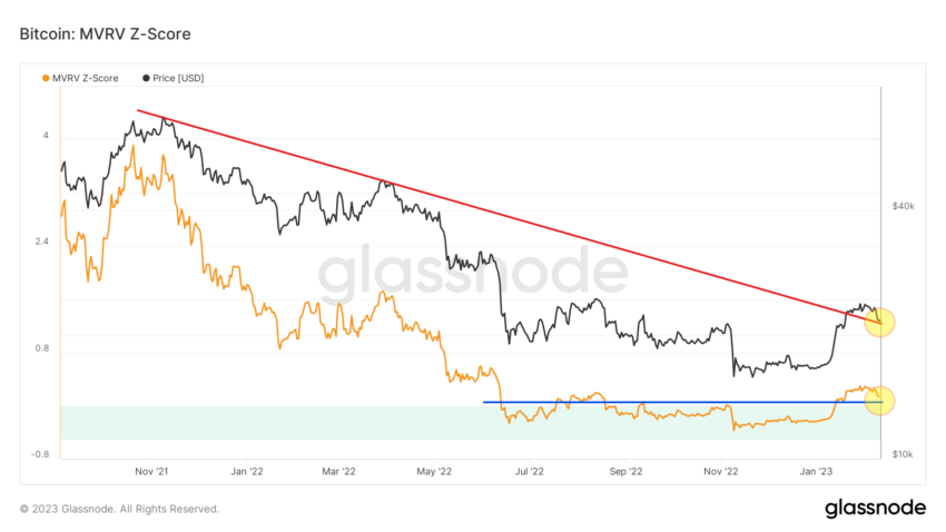 В пользу возобновления бычьего рынка говорит еще один аргумент. Цена BTC пробила долгосрочную логарифмическую линию сопротивления с момента достижения исторического максимума в $69 000 10 ноября 2021 года, а MVRV Z-Score направляется на ретест области перепроданности. Если два события произойдут одновременно, это станет весомым доказательством смены глобального тренда.