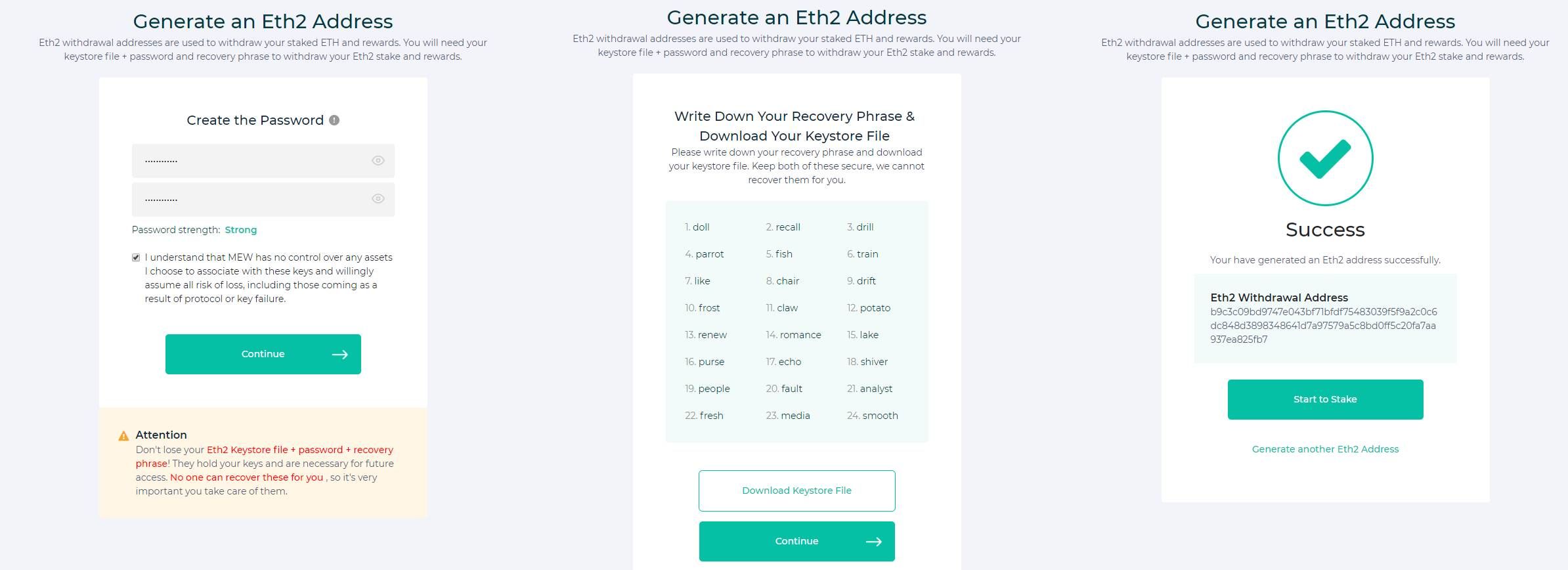 Для того чтобы заложить токены ETH под стейкинг в ETH2 через MEW пользователям необходимо сгенерировать специальный адрес ETH2 и сохранить информацию для доступа к нему, включая пароль, файл хранилища ключей и мнемоническую фразу.