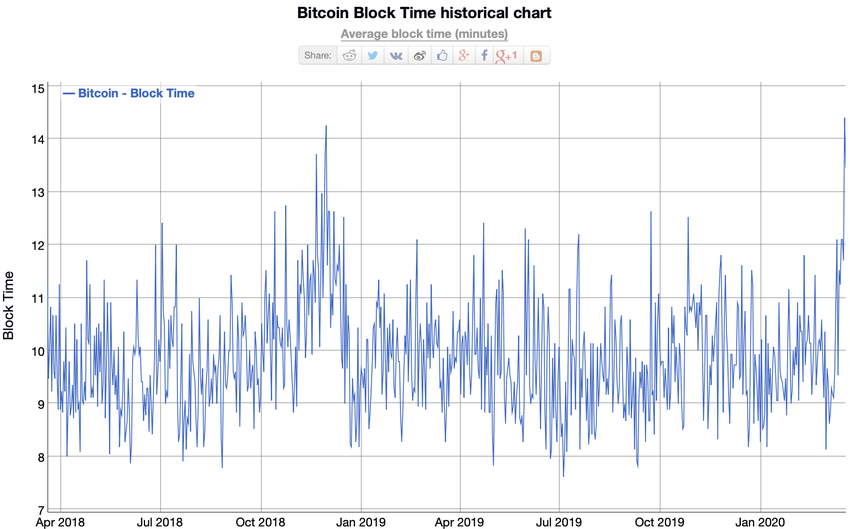 Время добычи биткоин-блока неуклонно растет. Обычно стабильный показатель неожиданно начал увеличиваться и достиг максимумов с конца 2018 года.